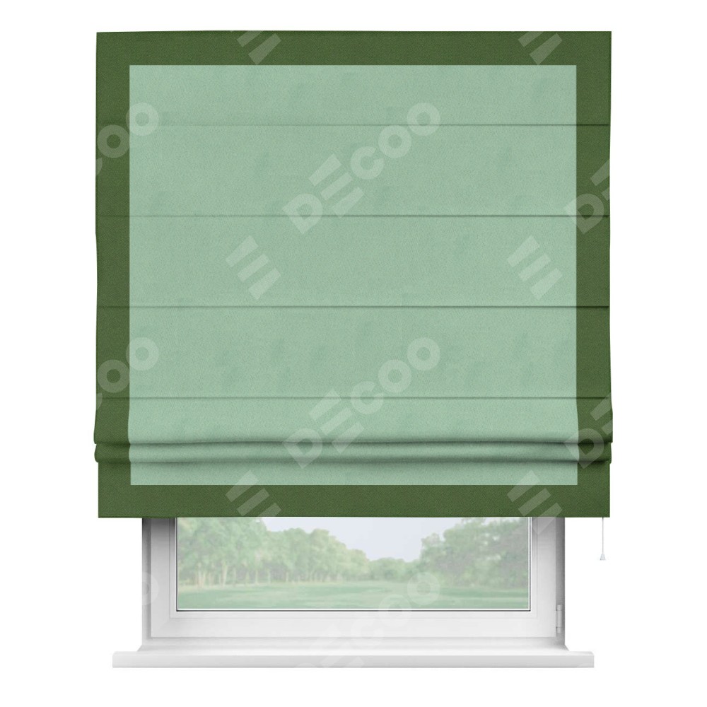 Римская штора производителя «Cortin», используется для проёма, пошита из ткани блэкаут однотонный ментоловый, артикул ткани 91572−1. Отделка шторы кантом «Чесс», ткань для канта используется из блэкаута однотонного разной расцветки на выбор. Имеет универсальный механизм и подходит для монтажа: на потолок, на стену и в нишу.