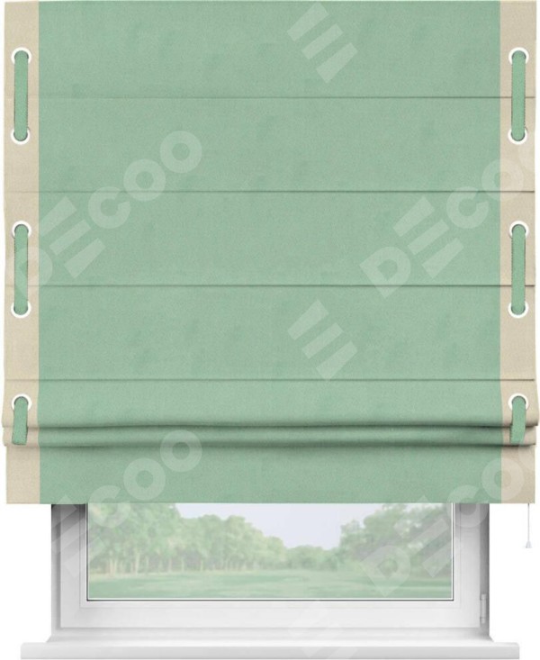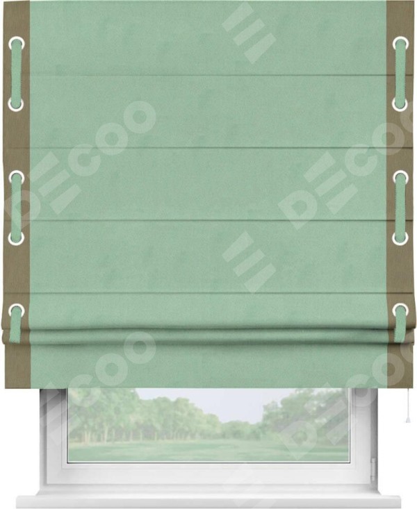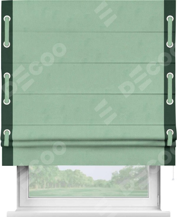 Римская штора «Кортин» для проема, блэкаут однотонный ментоловый с кантом Стрим Дуо (люверсы с пояском)