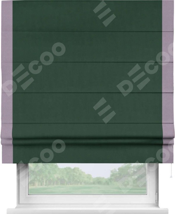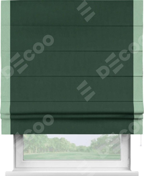 Римская штора производителя «Cortin», используется для проёма, пошита из ткани блэкаут однотонный зелёный, артикул ткани 91572−2. Отделка шторы кантом «Стрим Дуо», ткань для канта используется из блэкаута однотонного разной расцветки на выбор. Имеет универсальный механизм и подходит для монтажа: на потолок, на стену и в нишу.