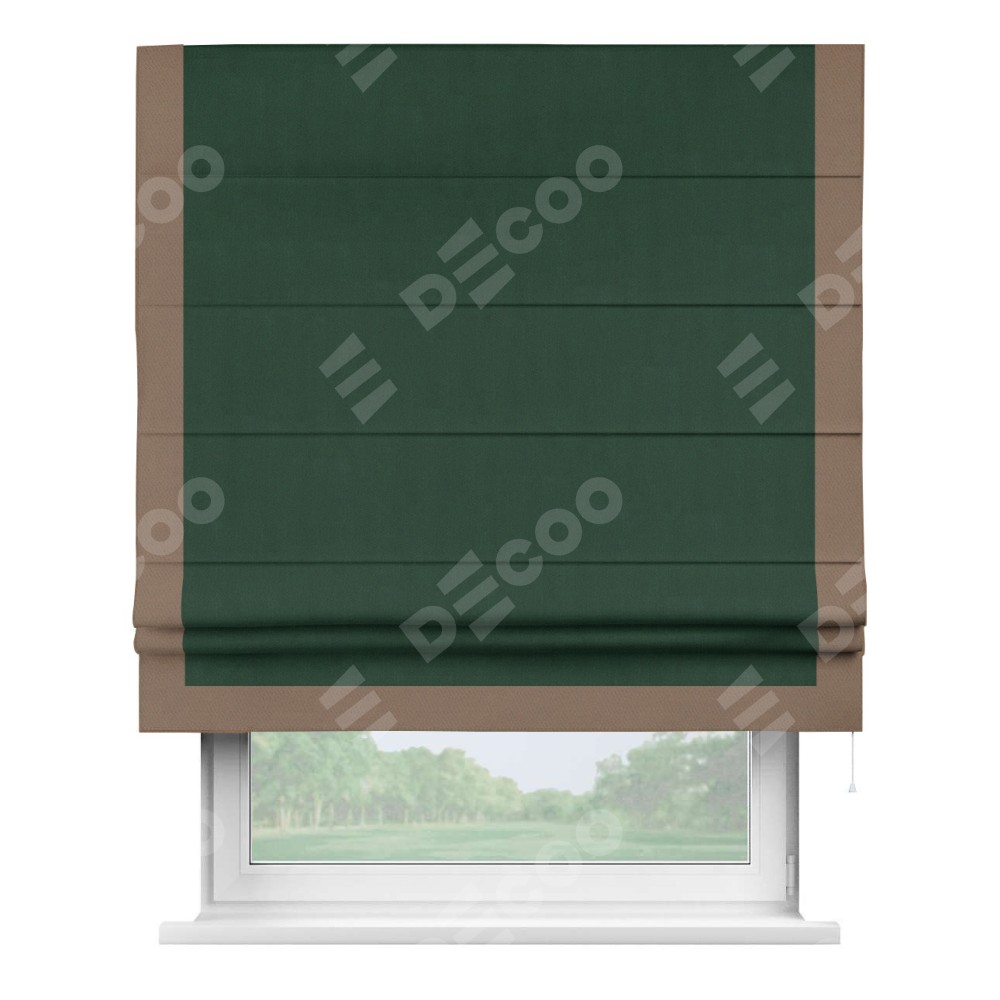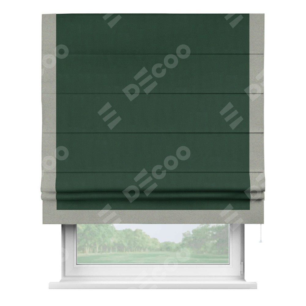Римская штора производителя «Cortin», используется для проёма, пошита из ткани блэкаут однотонный зелёный, артикул ткани 91572−2. Отделка шторы кантом «Виктория», ткань для канта используется из блэкаута однотонного разной расцветки на выбор. Имеет универсальный механизм и подходит для монтажа: на потолок, на стену и в нишу.
