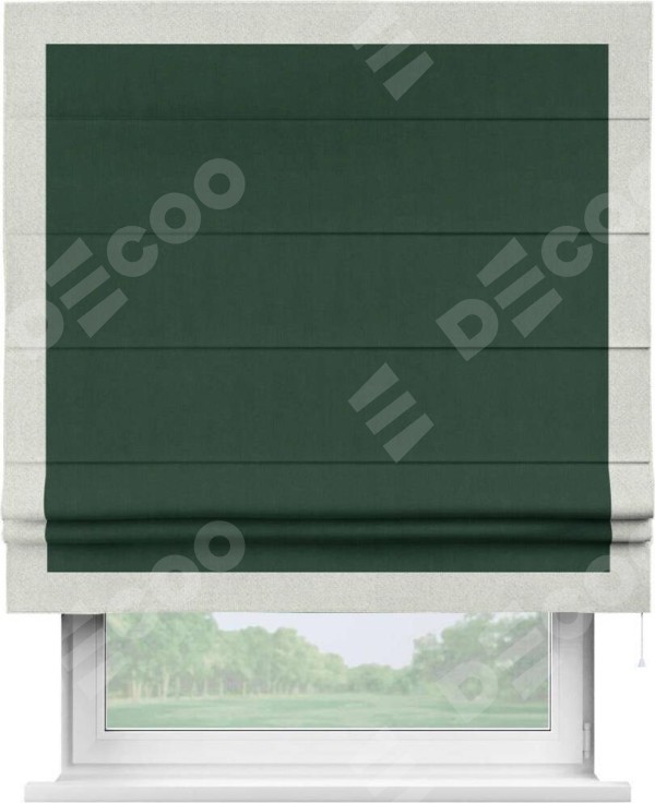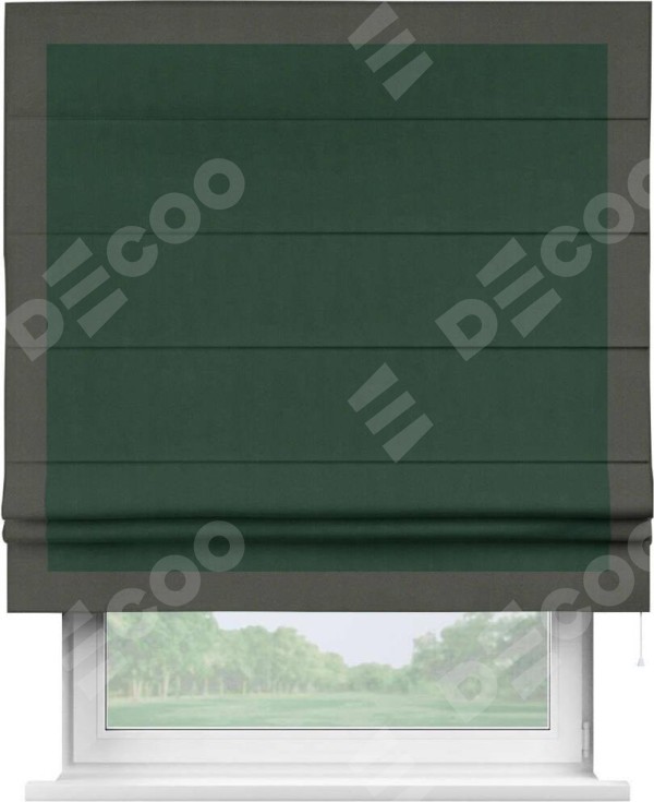 Римская штора производителя «Cortin», используется для проёма, пошита из ткани блэкаут однотонный зелёный, артикул ткани 91572−2. Отделка шторы кантом «Чесс», ткань для канта используется из блэкаута однотонного разной расцветки на выбор. Имеет универсальный механизм и подходит для монтажа: на потолок, на стену и в нишу.