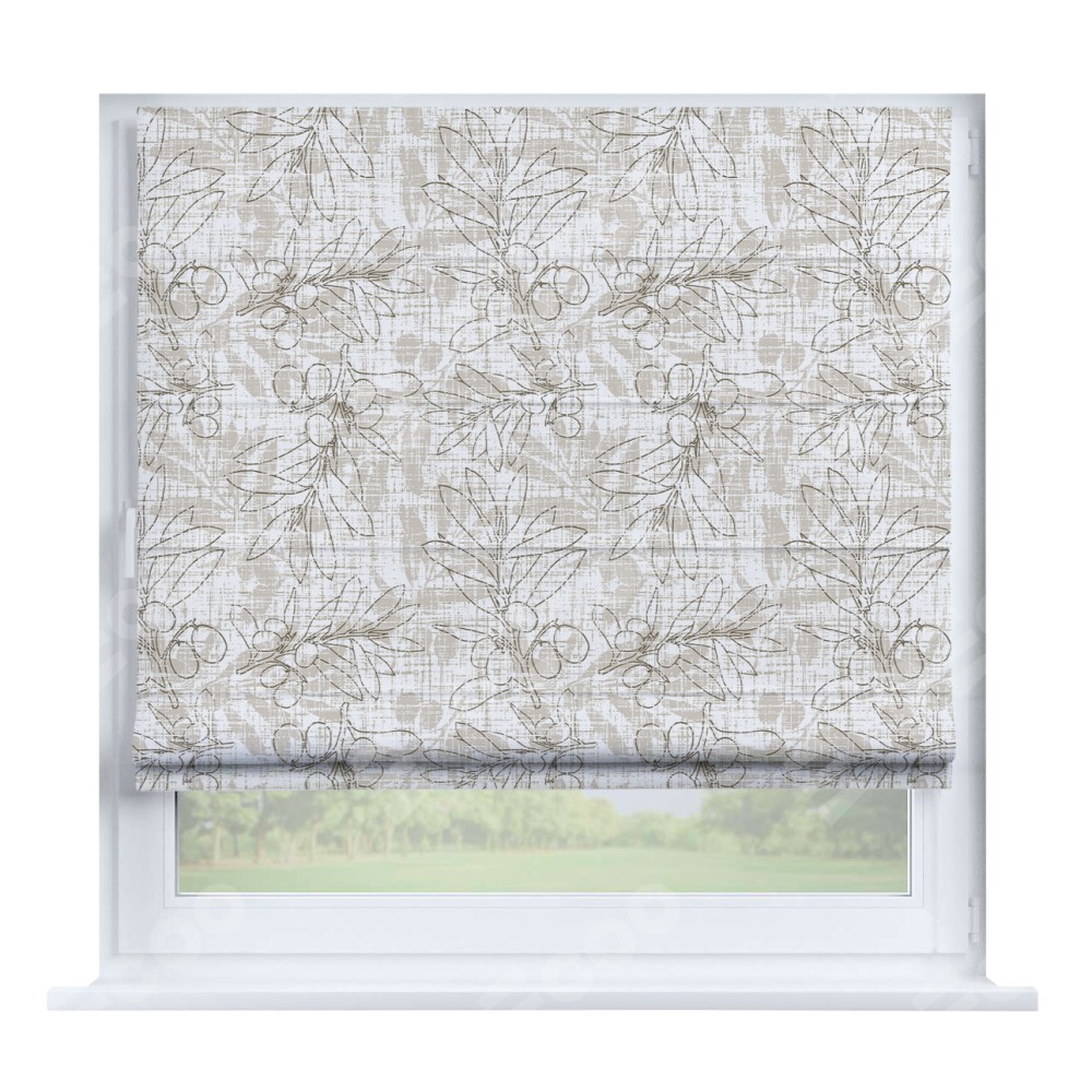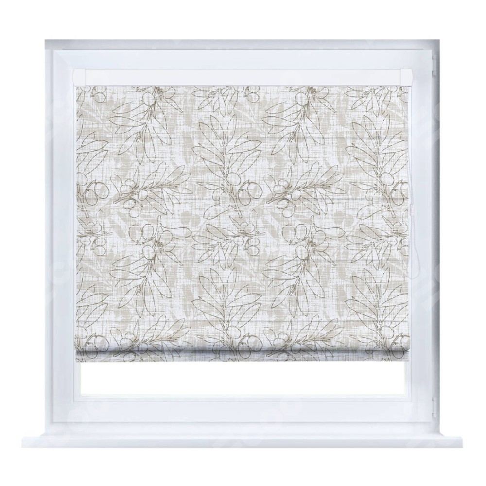Римская штора производителя «Cortin», устанавливается на створку окна, пошита из ткани блэкаут с нанесением сублимационной печати «Ветви оливы». Штора шьётся по индивидуальным размерам, для данного типа римской шторы возможная ширина от 35 до 150 см., высота до 250 см.
