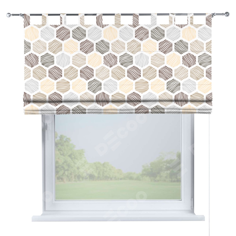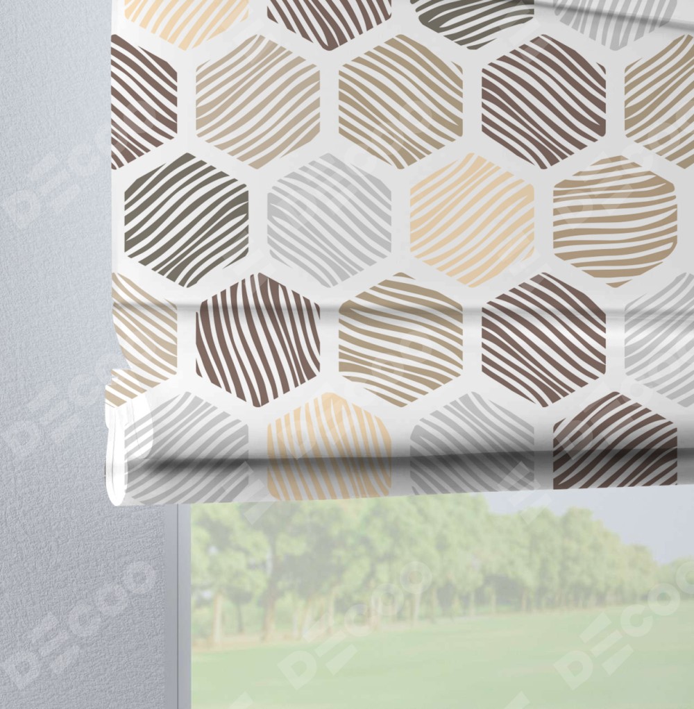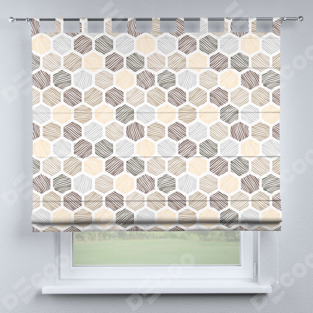 Римская штора производителя «Cortin», используется для проёма, пошита из ткани блэкаут с нанесением сублимационной печати «Мозаика соты». Данная модель пошита на петлях, комплектуется на выбор круглым карнизом и подходит для монтажа на стену. Римская штора на петлях имеет простую систему регулировки высоты, отличительным преимуществом данной модели является простой способ монтажа. Достаточно повесить ее на трубу и штора готова!