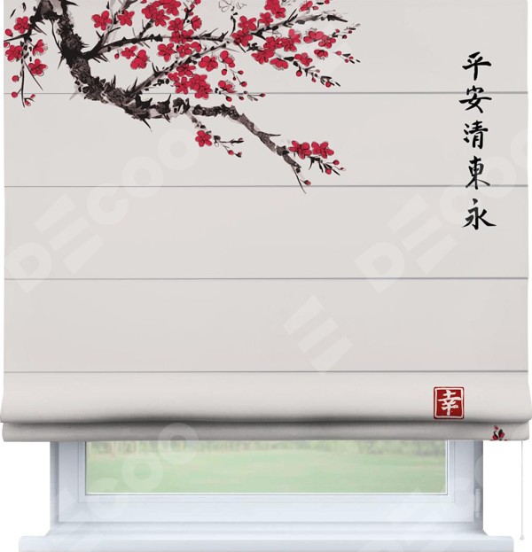 Классическая римская штора производителя «Cortin», пошита из ткани блэкаут с нанесением сублимационной печати «Цветущая сакура». Имеет универсальный механизм и подходит для монтажа: на потолок, на стену и в нишу.