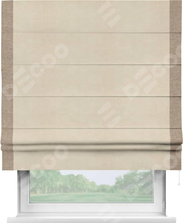 Римская штора производителя «Cortin», используется для проёма, пошита из ткани лён кашемир шампань, артикул 17205. Отделка шторы кантом «Стрим Дуо», ткань для канта используется из льна разной расцветки на выбор. Имеет универсальный механизм и подходит для монтажа: на потолок, на стену и в нишу.