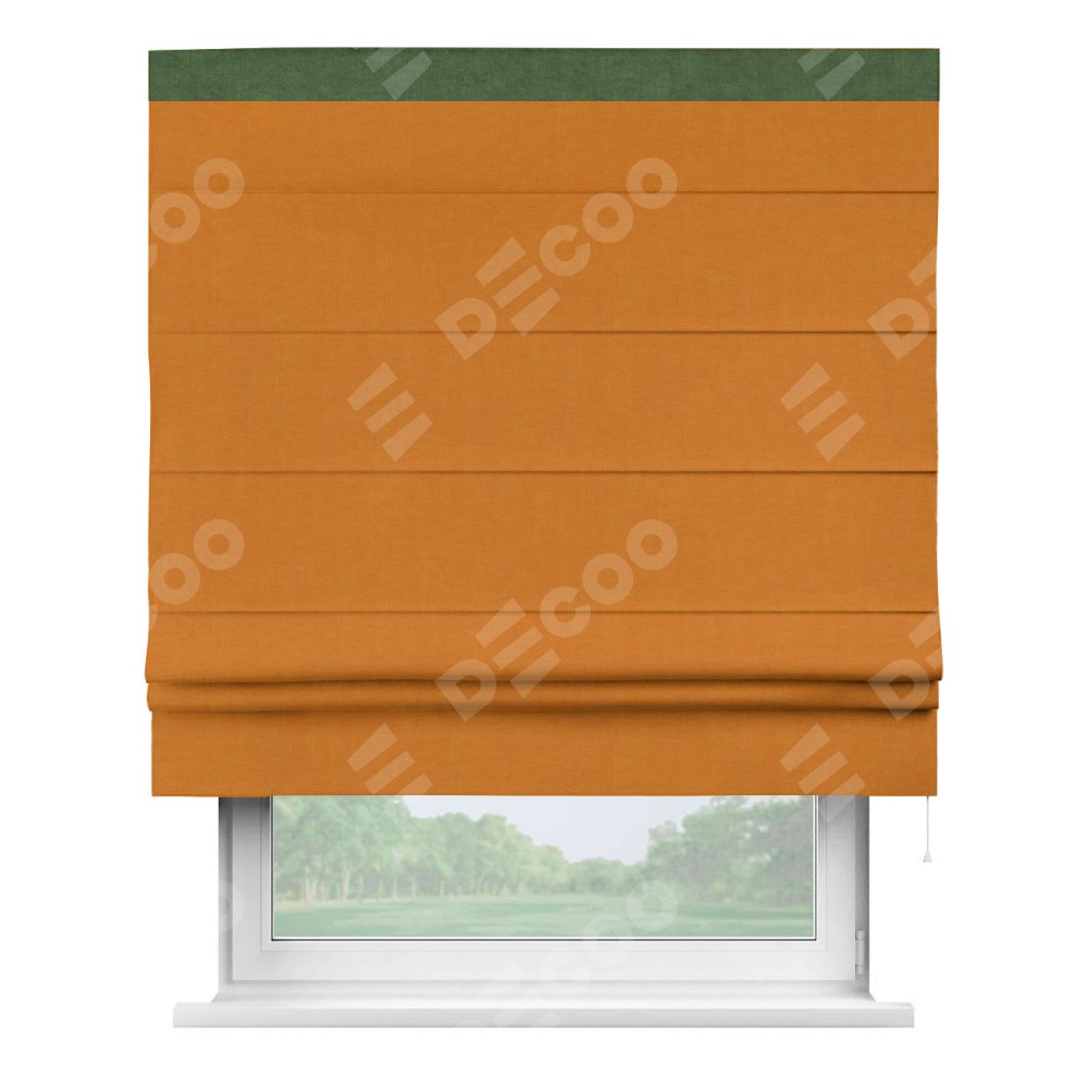 Римская штора производителя «Cortin», используется для проёма, пошита из ткани канвас оранжевый, артикул ткани v-106. Отделка шторы кантом «Кинг» (зелёный v-16), ткань для канта используется из канваса разной расцветки на выбор. Имеет универсальный механизм и подходит для монтажа: на потолок, на стену и в нишу.
