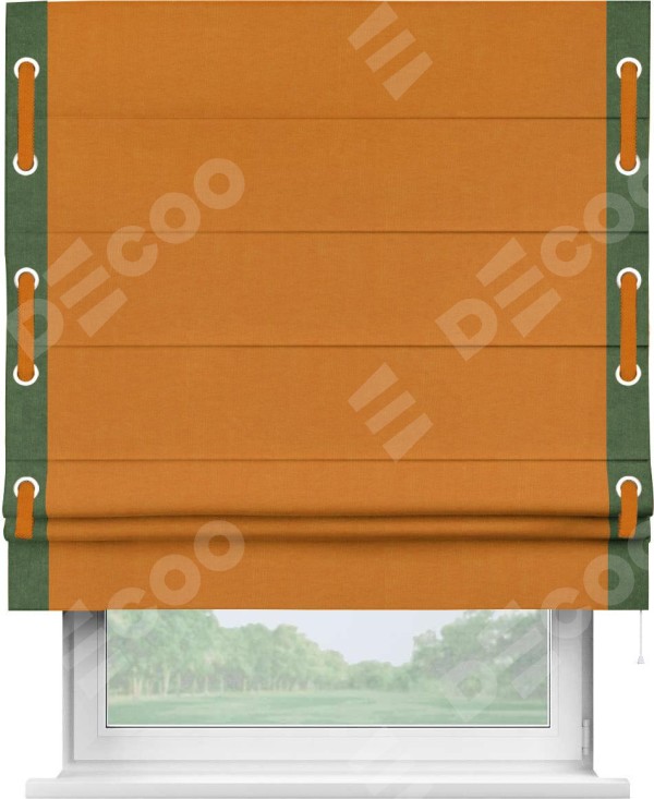 Римская штора производителя «Cortin», используется для проёма, пошита из ткани канвас оранжевый, артикул ткани v-106. Отделка шторы кантом «Стрим Дуо» (зелёный v-16) на кантах расположены люверсы с пояском, ткань для канта используется из канваса разной расцветки на выбор. Ткань для пояска обычно используется из основной ткани шторы, а так же можно сделать из любой расцветки по желанию. Имеет универсальный механизм и подходит для монтажа: на потолок, на стену и в нишу.