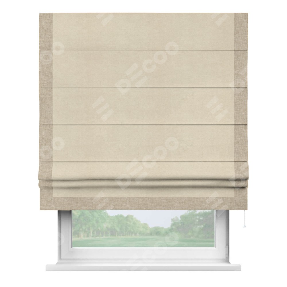Римская штора производителя «Cortin», используется для проёма, пошита из ткани лён кашемир шампань, артикул 17205. Отделка шторы кантом «Виктория», ткань для канта используется из льна разной расцветки на выбор. Имеет универсальный механизм и подходит для монтажа: на потолок, на стену и в нишу.