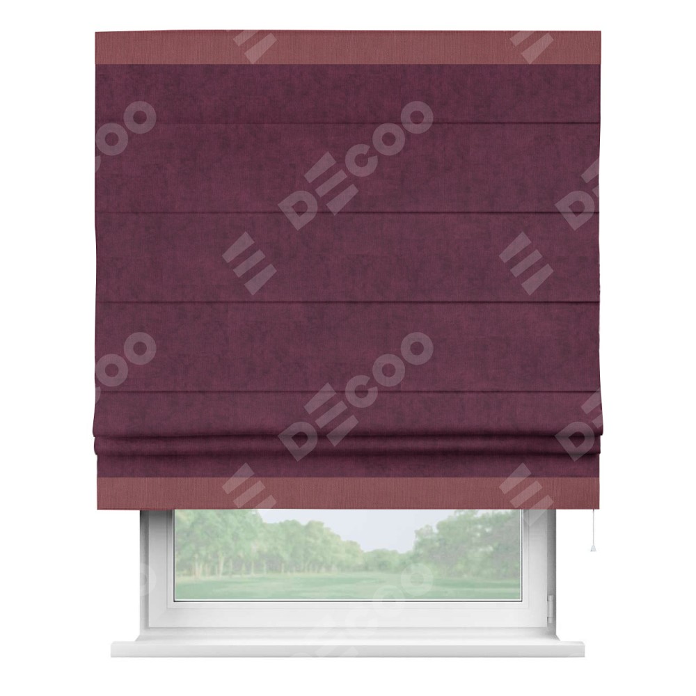 Римская штора производителя «Cortin», используется для проёма, пошита из ткани канвас фиолетовый, артикул ткани v-99. Отделка шторы кантом «Горизонт» (ягодный v-28), ткань для канта используется из канваса разной расцветки на выбор. Имеет универсальный механизм и подходит для монтажа: на потолок, на стену и в нишу.