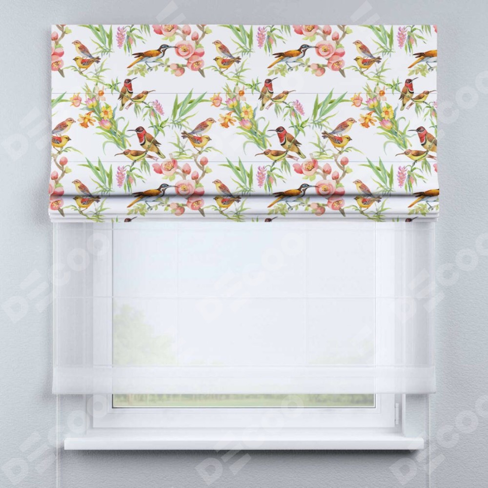 Двойная римская штора «День-ночь» от производителя Cortin предназначена для использования в проёмах. Эта штора уникальна тем, что состоит из двух полотен. На лицевой стороне находится блэкаут с нанесением сублимационной печати «Певчие птички», обеспечивающий эффективное затемнение. В комплект также входит вторая ткань — легкий белый тюль (артикул: V-01), который добавляет изящества и легкости оформлению окна. Кроме того, доступны и другие разновидности ткани тюль, выбор которых доступен по ссылке .