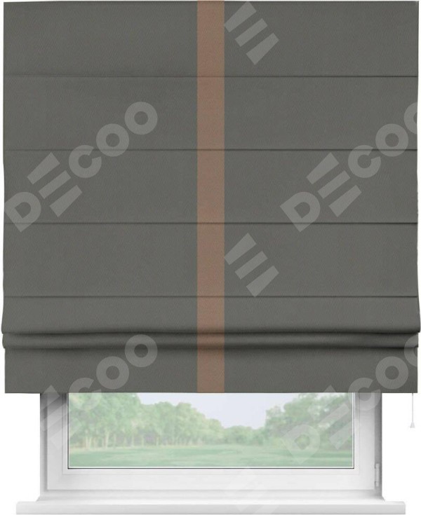 Римская штора производителя «Cortin», используется для проёма, пошита из ткани блэкаут однотонный тёмно-серый, артикул ткани 91570. Отделка шторы кантом «Хайвей», ткань для канта используется из блэкаута однотонного разной расцветки на выбор. Имеет универсальный механизм и подходит для монтажа: на потолок, на стену и в нишу.