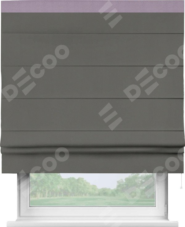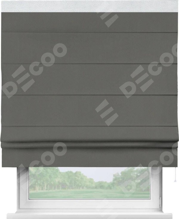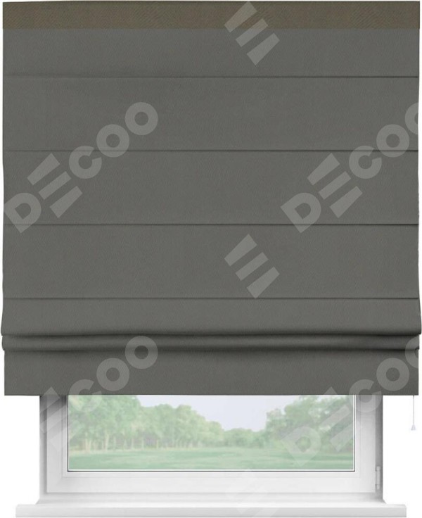 Римская штора производителя «Cortin», используется для проёма, пошита из ткани блэкаут однотонный тёмно-серый, артикул ткани 91570. Отделка шторы кантом «Кинг», ткань для канта используется из блэкаута однотонного разной расцветки на выбор. Имеет универсальный механизм и подходит для монтажа: на потолок, на стену и в нишу.