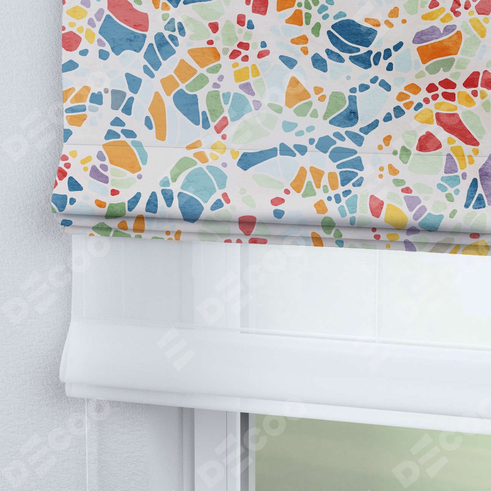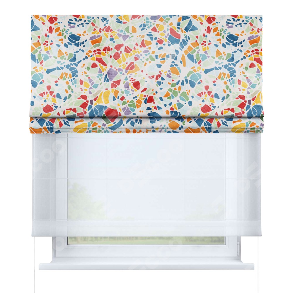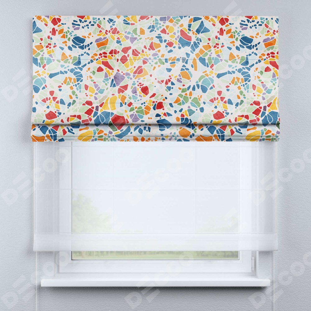 Двойная римская штора «День-ночь» от производителя Cortin предназначена для использования в проёмах. Эта штора уникальна тем, что состоит из двух полотен. На лицевой стороне находится блэкаут с нанесением сублимационной печати «Калейдоскоп», обеспечивающий эффективное затемнение. В комплект также входит вторая ткань — легкий белый тюль (артикул: V-01), который добавляет изящества и легкости оформлению окна. Кроме того, доступны и другие разновидности ткани тюль, выбор которых доступен по  ссылке .
