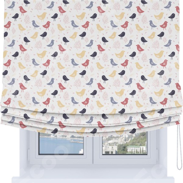 Римская штора Soft производителя «Cortin», используется для проёма, пошита из ткани блэкаут с нанесением сублимационной печати «Цветные птички». Имеет универсальный механизм и подходит для монтажа: на потолок, на стену и в нишу. В отличие от стандартных римских штор, римская штора Soft не имеет горизонтальных вставок и нижнего отвеса. Это позволяет ткани произвольно драпироваться в свободные мягкие складки.