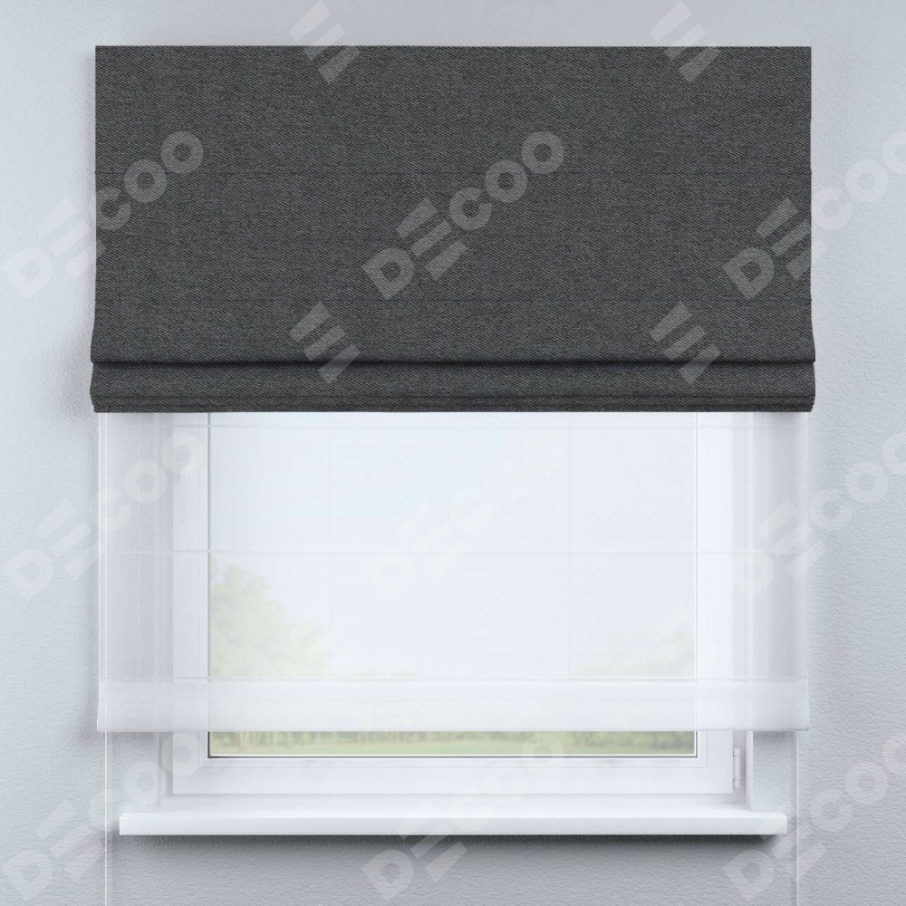 Двойная римская штора «День-ночь» от производителя Cortin предназначена для использования в проёмах. Эта штора уникальна тем, что состоит из двух полотен. На лицевой стороне находится твид блэкаут тёмно-серый (артикул: 90938), обеспечивающий эффективное затемнение. В комплект также входит вторая ткань — легкий белый тюль (артикул: V-01), который добавляет изящества и легкости оформлению окна. Кроме того, доступны и другие разновидности ткани тюль, выбор которых доступен по ссылке .
