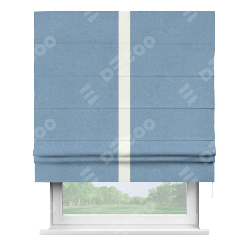 Римская штора производителя «Cortin», используется для проёма, пошита из ткани канвас голубой, артикул ткани 92729. Отделка шторы кантом «Хайвей» (молочный v-93), ткань для канта используется из канваса разной расцветки на выбор. Имеет универсальный механизм и подходит для монтажа: на потолок, на стену и в нишу.