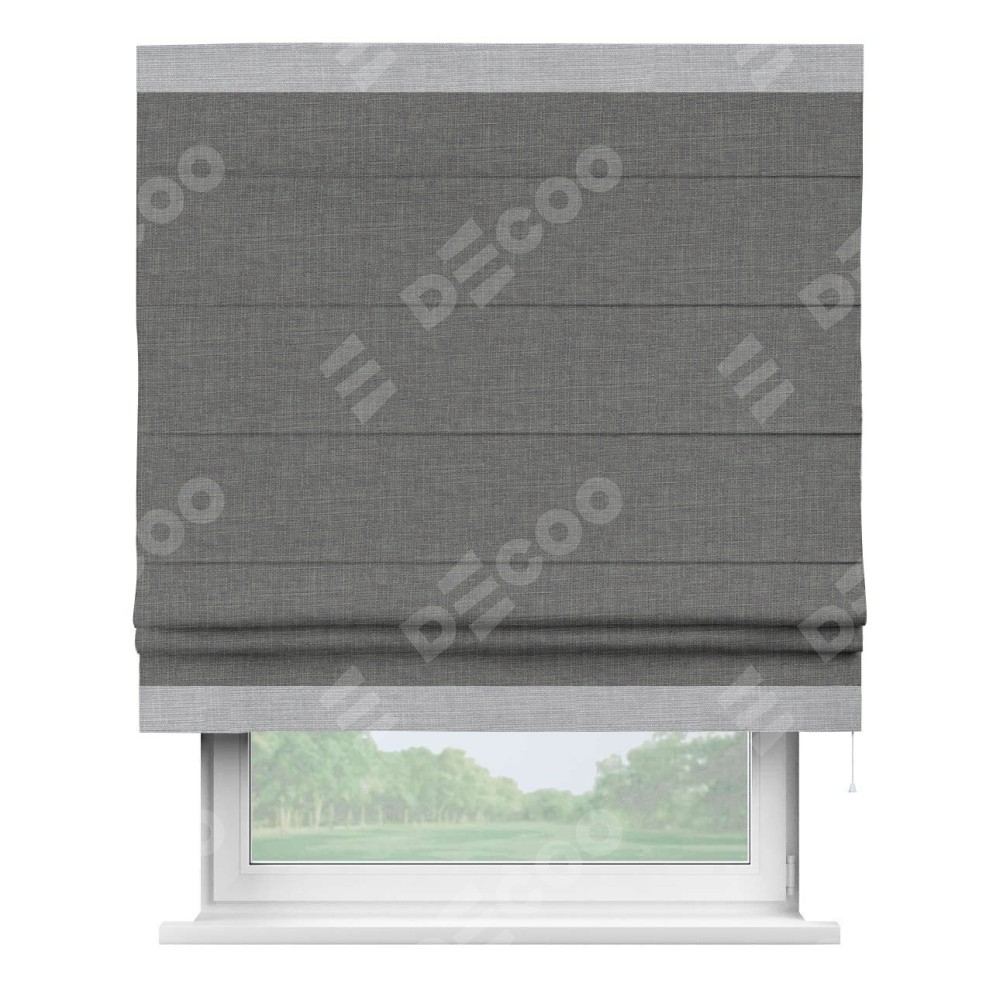 Римская штора производителя «Cortin», используется для проёма, пошита из ткани лён тёмно-серый, артикул 7441. Отделка шторы кантом «Горизонт», ткань для канта используется из льна разной расцветки на выбор. Имеет универсальный механизм и подходит для монтажа: на потолок, на стену и в нишу.