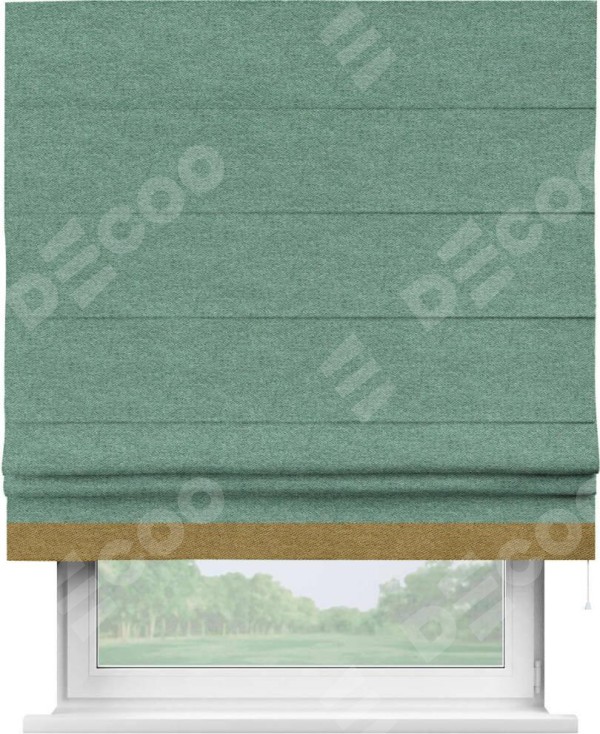 Римская штора производителя «Cortin», используется для проёма, пошита из ткани твид блэкаут бирюзовый, артикул 90934. Отделка шторы кантом «Джестер», ткань для канта используется из твида разной расцветки на выбор. Имеет универсальный механизм и подходит для монтажа: на потолок, на стену и в нишу.