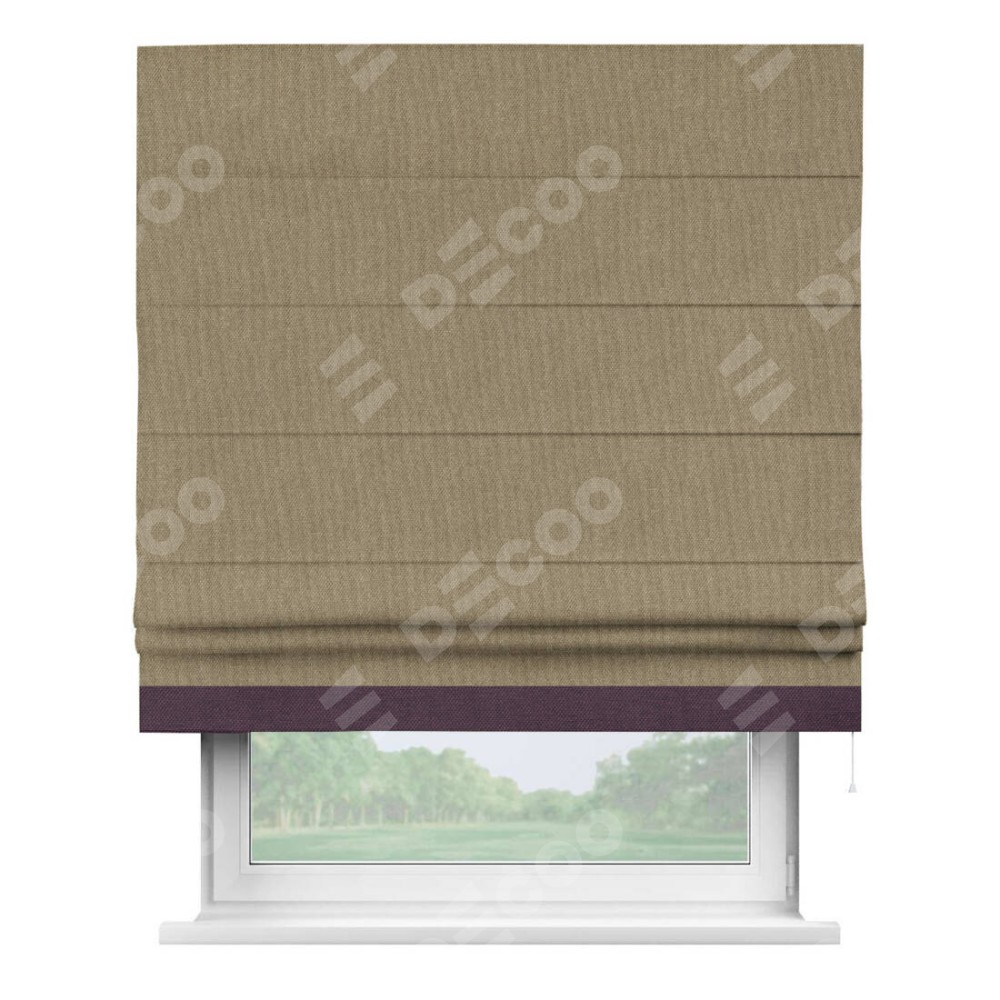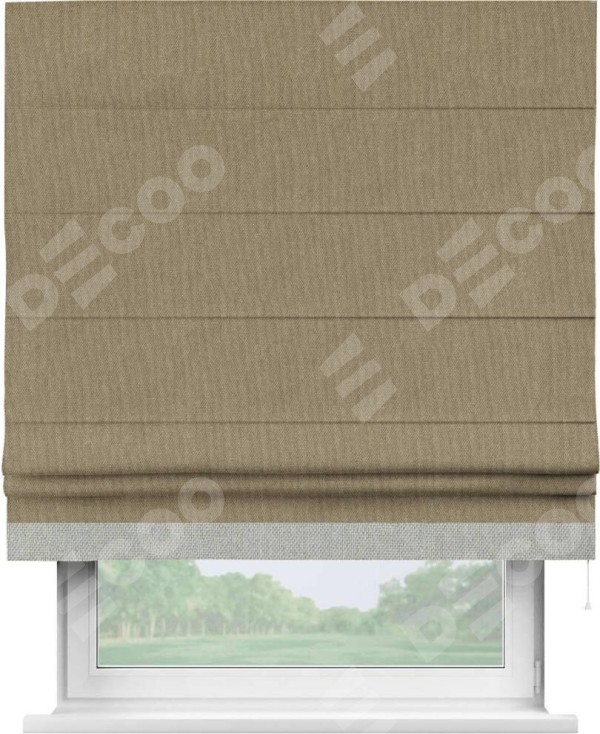 Римская штора пошита из ткани лён димаут тёмно-бежевый, артикул: 16261, с отделкой кантом «Джестер» выделяется своей уникальной особенностью — кантом, расположенным только снизу шторы. Этот дизайн добавляет оригинальности и игривости оконному оформлению, делая акцент на нижней части шторы и создавая интересный визуальный эффект. Отделка кантом на нижнем крае не только служит эстетической функции, но и способствует увеличению прочности и износостойкости ткани в этом месте.