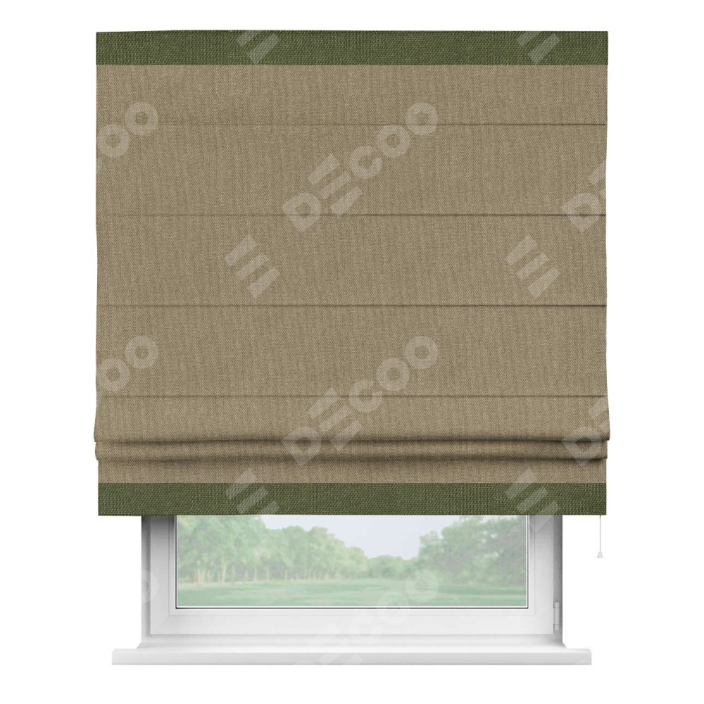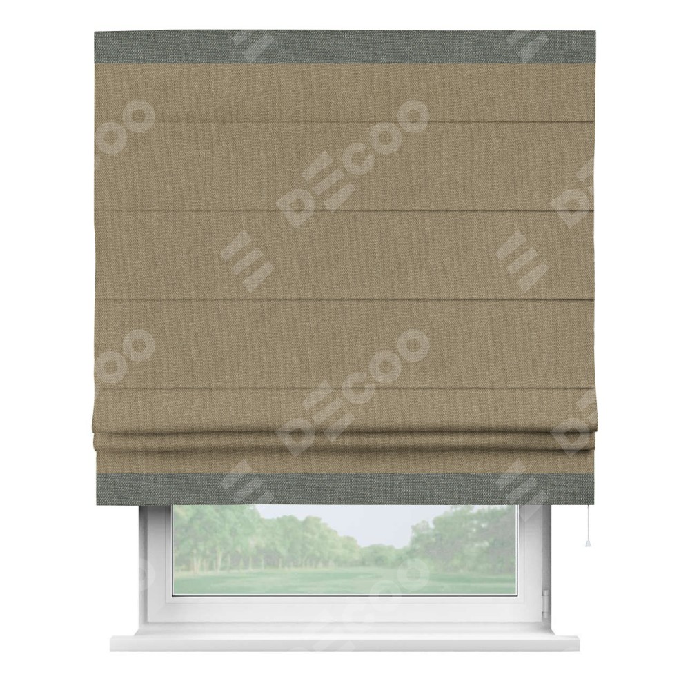 Римская штора пошита из ткани лён димаут тёмно-бежевый, артикул: 16261, с отделкой кантом «Горизонт» предлагает уникальное дизайнерское решение, при котором кант располагается только вверху и снизу шторы. Такое решение делает акцент на горизонтальных линиях, визуально расширяя пространство и придавая окну более строгий и организованный вид. Отделка кантом в этих ключевых местах не только украшает штору, но и способствует её долговечности, защищая наиболее уязвимые к износу края.