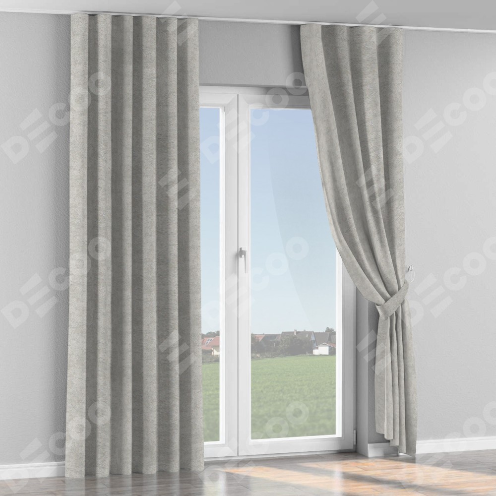 Комплект прямых штор, от производителя «Cortin», пошиты из ткани софт мрамор светло-серый, артикул ткани 93582. С изнаночной стороны в верхней части штор пристрачивается шторная лента с декоративными складками «Волна». Для создания элегантных складок прямые шторы шьются по стандарту с коэффициентом 1:2 (на 100 см. ширины проёма 200 см. ширины ткани).