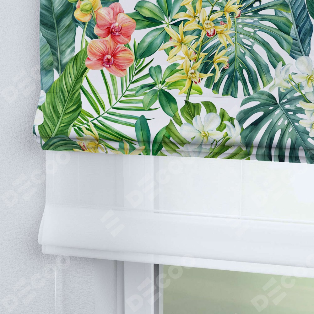 Двойная римская штора «День-ночь» от производителя Cortin предназначена для использования в проёмах. Эта штора уникальна тем, что состоит из двух полотен. На лицевой стороне находится блэкаут с нанесением сублимационной печати «Орхидеи в тропиках», обеспечивающий эффективное затемнение. В комплект также входит вторая ткань — легкий белый тюль (артикул: V-01), который добавляет изящества и легкости оформлению окна. Кроме того, доступны и другие разновидности ткани тюль, выбор которых доступен по ссылке .