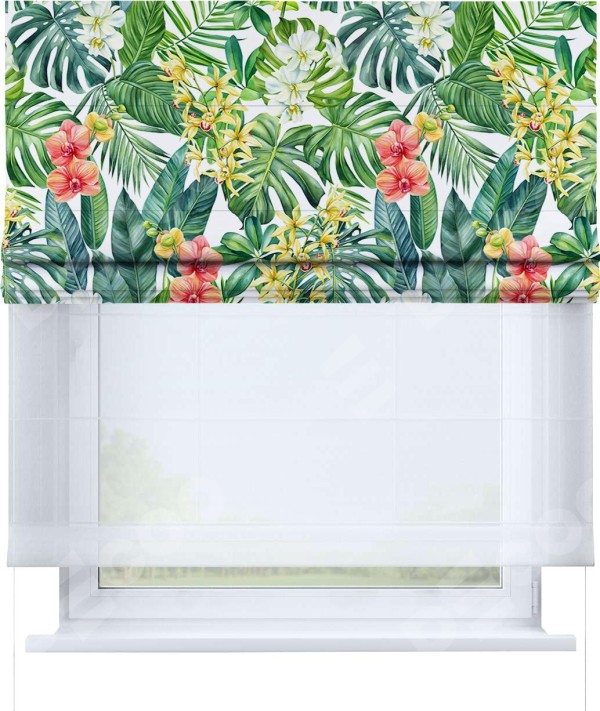 Двойная римская штора «День-ночь» от производителя Cortin предназначена для использования в проёмах. Эта штора уникальна тем, что состоит из двух полотен. На лицевой стороне находится блэкаут с нанесением сублимационной печати «Орхидеи в тропиках», обеспечивающий эффективное затемнение. В комплект также входит вторая ткань — легкий белый тюль (артикул: V-01), который добавляет изящества и легкости оформлению окна. Кроме того, доступны и другие разновидности ткани тюль, выбор которых доступен по  ссылке .