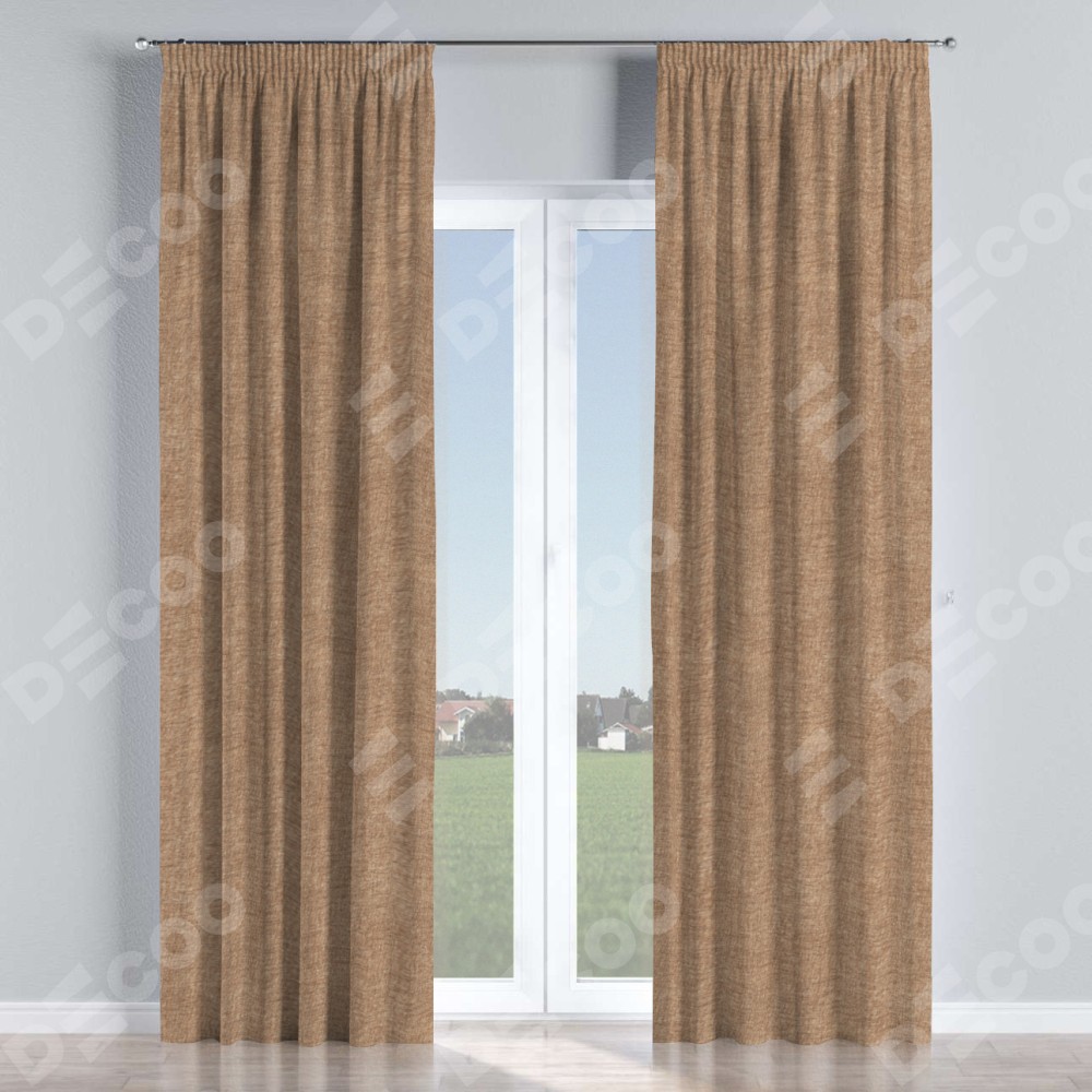 Комплект прямых штор, от производителя «Cortin», пошиты из ткани рогожка димаут светло-коричневый, артикул ткани 91017. С изнаночной стороны в верхней части штор пристрачивается шторная лента с декоративными складками «Карандаш». Для создания элегантных складок прямые шторы шьются по стандарту с коэффициентом 1:2 (на 100 см. ширины проёма 200 см. ширины ткани).