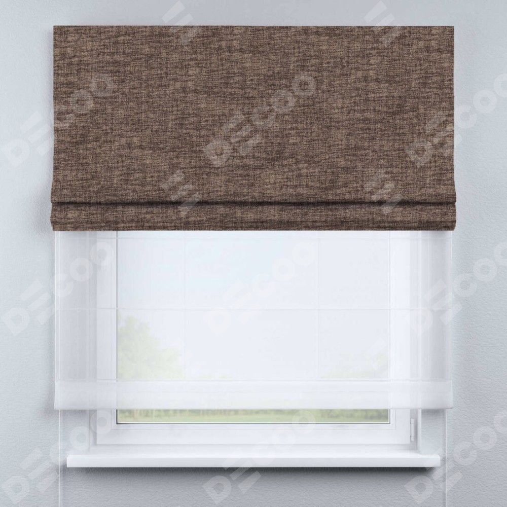 Двойная римская штора «День-ночь» от производителя Cortin предназначена для использования в проёмах. Эта штора уникальна тем, что состоит из двух полотен. На лицевой стороне находится рогожка димаут коричневый (артикул: 91018), обеспечивающий эффективное затемнение. В комплект также входит вторая ткань — легкий белый тюль (артикул: V-01), который добавляет изящества и легкости оформлению окна. Кроме того, доступны и другие разновидности ткани тюль, выбор которых доступен по  ссылке .