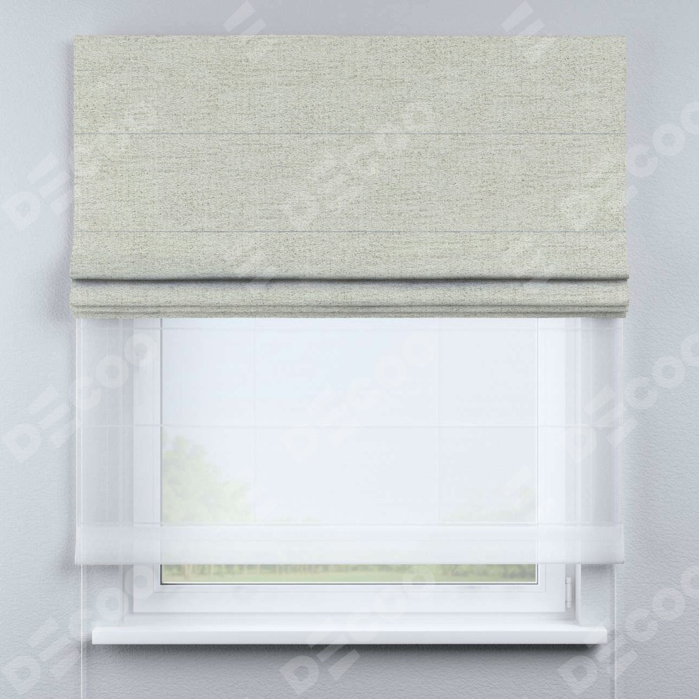 Двойная римская штора «День-ночь» от производителя Cortin предназначена для использования в проёмах. Эта штора уникальна тем, что состоит из двух полотен. На лицевой стороне находится рогожка димаут серо-бежевый (артикул: 91014), обеспечивающий эффективное затемнение. В комплект также входит вторая ткань — легкий белый тюль (артикул: V-01), который добавляет изящества и легкости оформлению окна. Кроме того, доступны и другие разновидности ткани тюль, выбор которых доступен по  ссылке .