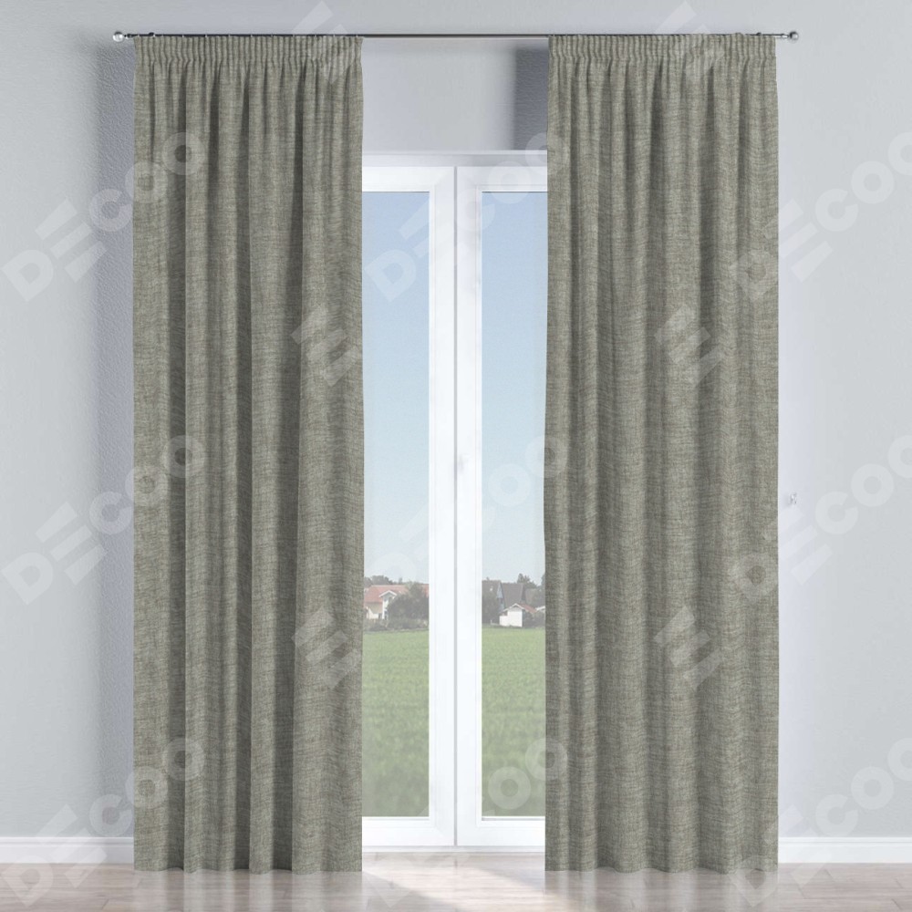 Комплект прямых штор, от производителя «Cortin», пошиты из ткани рогожка димаут серый дуб, артикул ткани 91028. С изнаночной стороны в верхней части штор пристрачивается шторная лента с декоративными складками «Карандаш». Для создания элегантных складок прямые шторы шьются по стандарту с коэффициентом 1:2 (на 100 см. ширины проёма 200 см. ширины ткани).