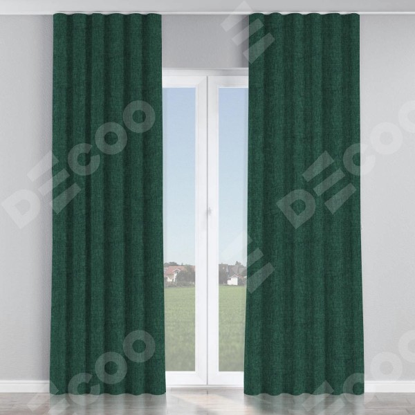 Комплект прямых штор, от производителя «Cortin», пошиты из ткани рогожка димаут тёмно-зелёный, артикул ткани 91022. С изнаночной стороны в верхней части штор пристрачивается шторная лента с декоративными складками «Волна». Для создания элегантных складок прямые шторы шьются по стандарту с коэффициентом 1:2 (на 100 см. ширины проёма 200 см. ширины ткани).