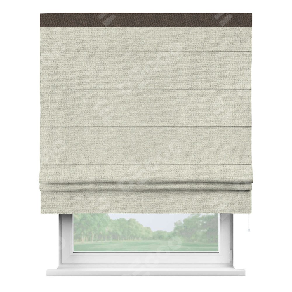 Римская штора пошита из ткани твид блэкаут шампань, артикул: 90929, с отделкой кантом «Кинг» отличается своей необычной особенностью: кант располагается исключительно сверху шторы. Такой дизайн делает акцент на верхней части окна, визуально поднимая потолок и придавая интерьеру более возвышенный и изысканный вид. Отделка кантом на верхней кромке не только украшает штору, но и может служить дополнительной защитой от износа в месте наибольшего контакта с механизмом управления шторой.