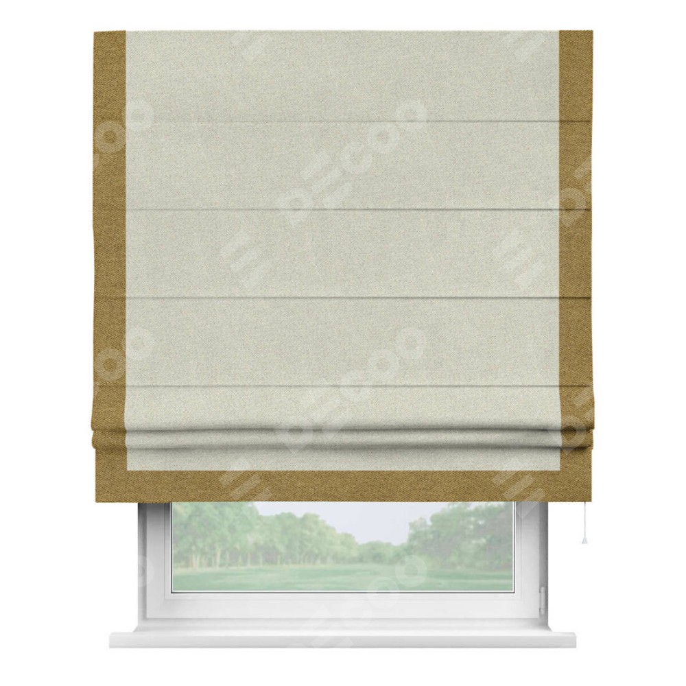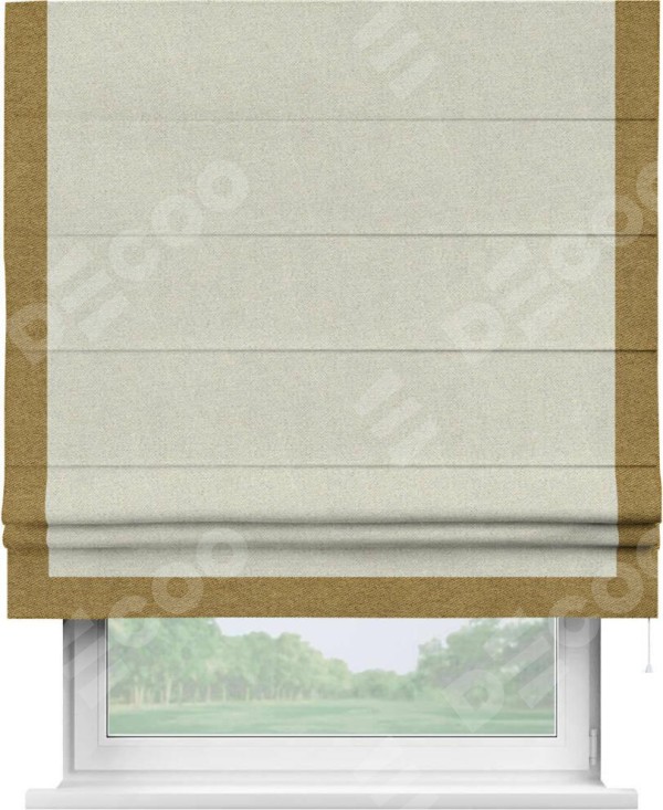 Римская штора с отделкой кантом «Виктория», пошита из ткани твид блэкаут шампань, артикул: 90929. представляет собой элегантное решение для оконного оформления. Кант по бокам и снизу шторы добавляет изысканности и аккуратности внешнему виду, подчеркивая линии и форму шторы. Этот элемент декора не только украшает, но и выполняет практическую функцию, защищая края ткани от износа. Кант может быть выполнен в контрастном или гармонирующем цвете, что позволяет добиться различных стилевых эффектов и легко вписать штору в интерьер комнаты.