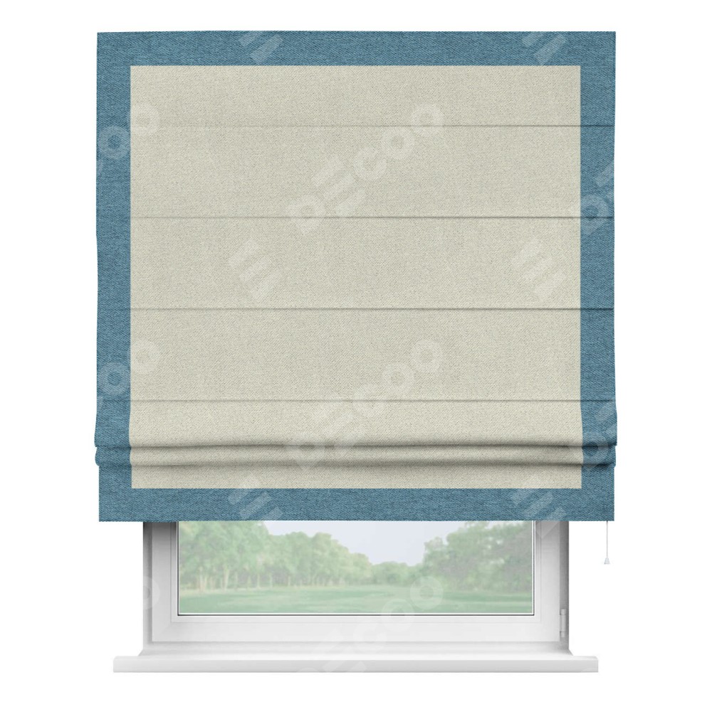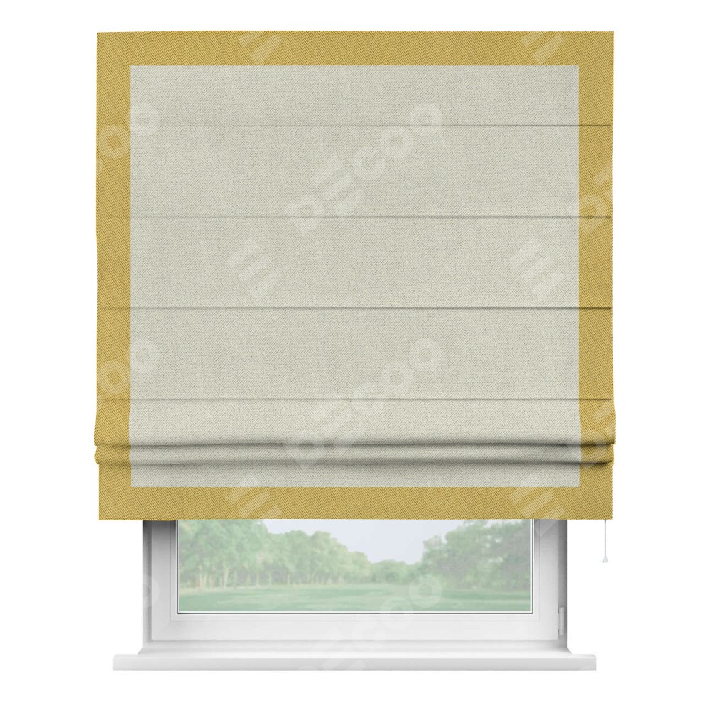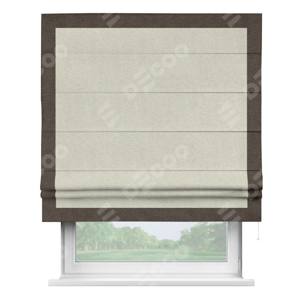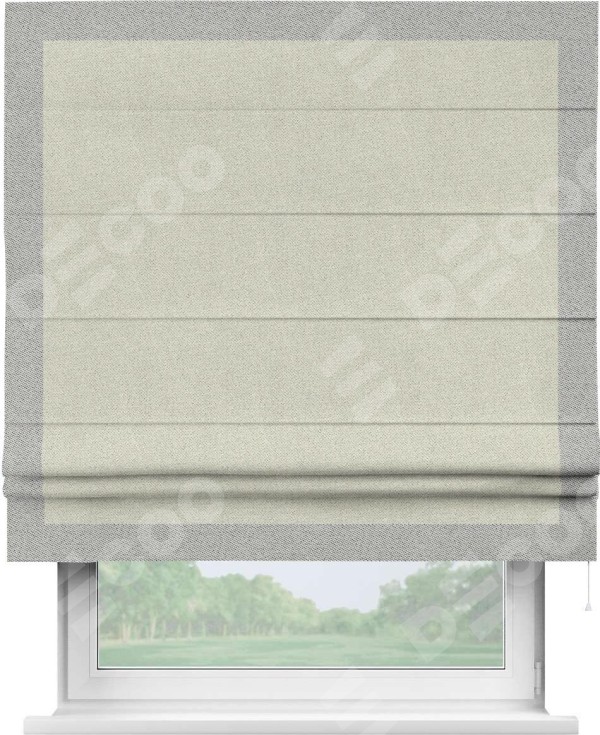 Римская штора пошита из ткани твид блэкаут шампань, артикул: 90929, с отделкой кантом «Чесс» отличается своей уникальной деталью — наличием канта не только по бокам и снизу, но и сверху по всем краям шторы. Это придает шторе особенно аккуратный и завершенный вид, делая акцент на границах и форме шторы. Отделка кантом по всему периметру шторы усиливает её декоративные качества и подчеркивает строгую геометрию, что может быть особенно актуально для современных и минималистичных интерьеров.
