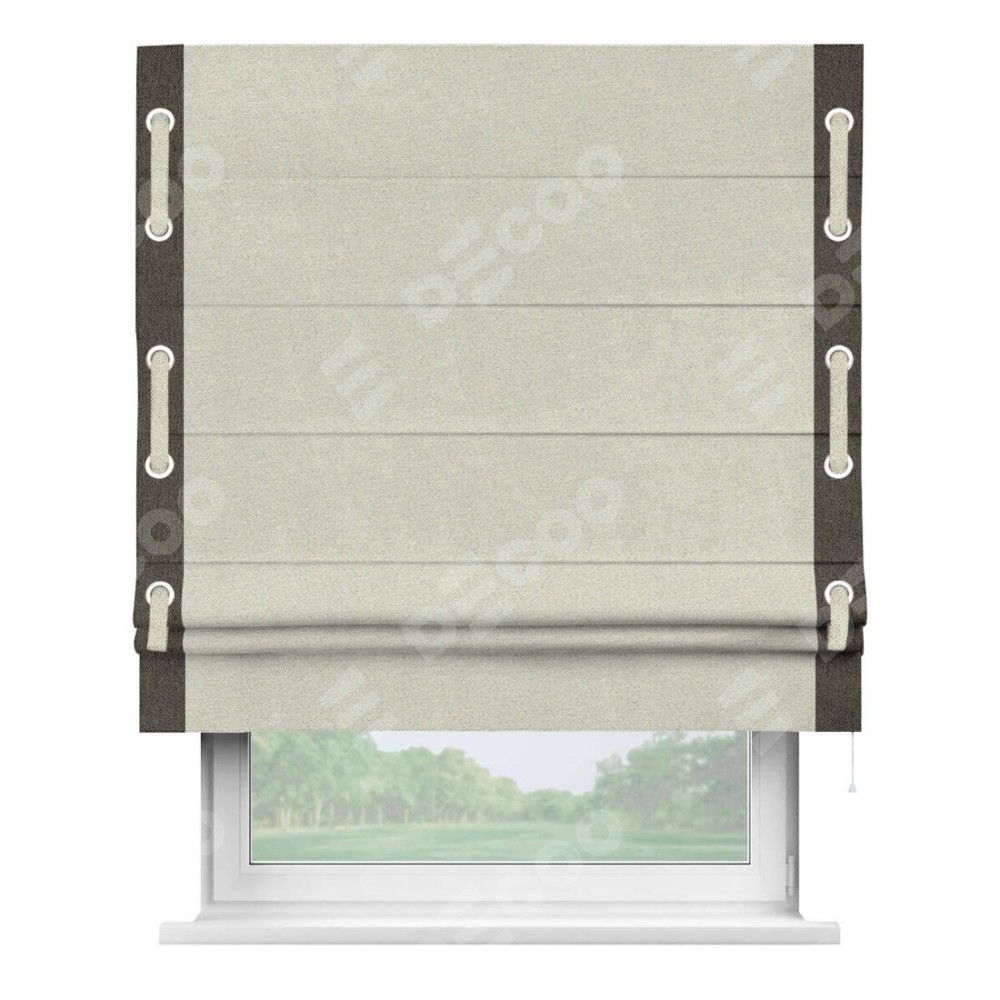 Римская штора пошита из ткани твид блэкаут шампань, артикул: 90929, с отделкой кантом «Стрим Дуо», дополненная декоративными люверсами на этих кантах и протянутым пояском из основного цвета римской шторы, представляет собой высоко декоративное и функциональное решение для оконного оформления. Канты, расположенные по обеим боковым сторонам шторы, уже добавляют изысканности и завершенности внешнему виду. Добавление люверсов и пояска не только усиливает декоративный эффект, но и придает шторе дополнительную текстурность и глубину.