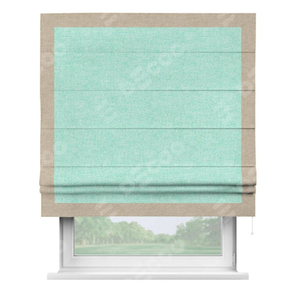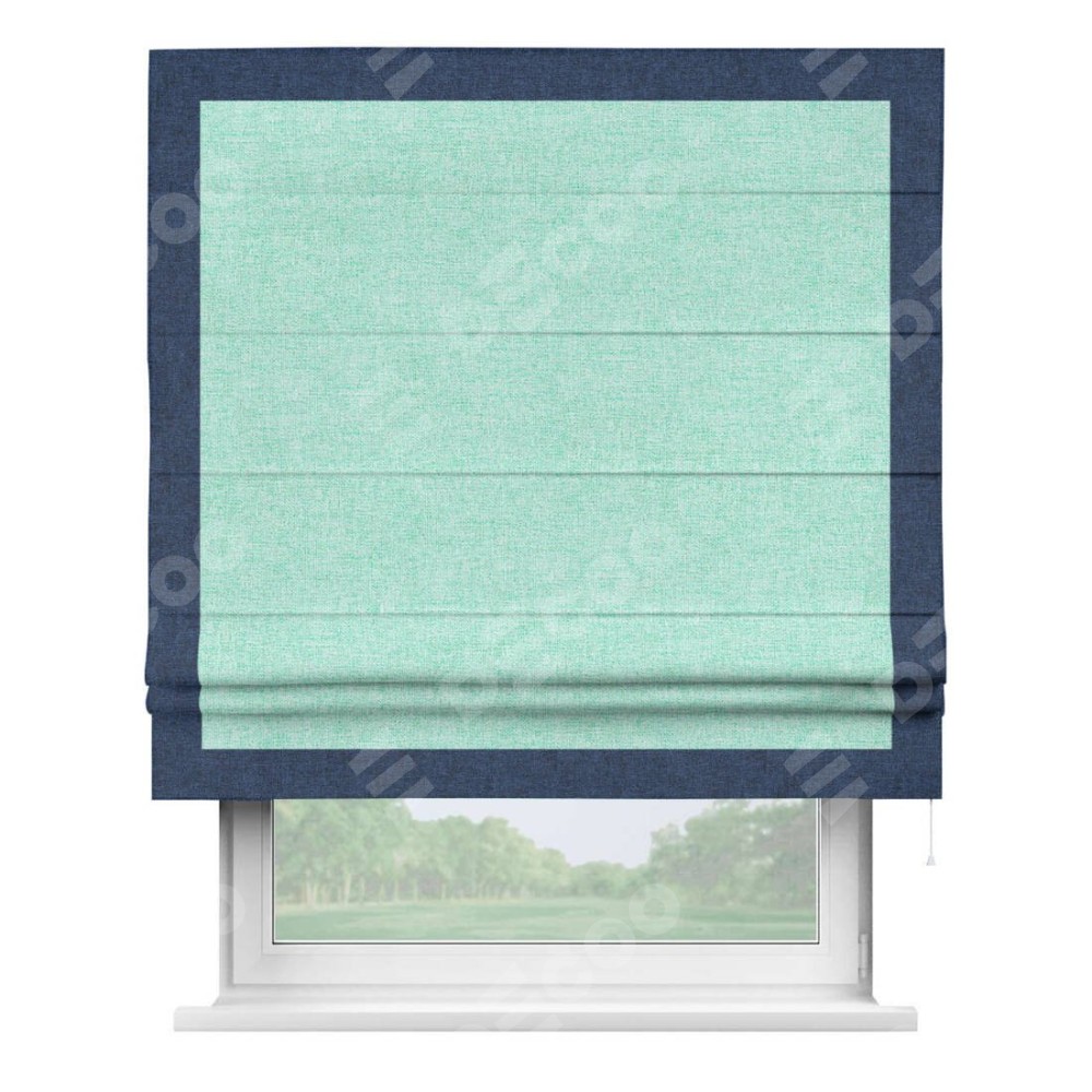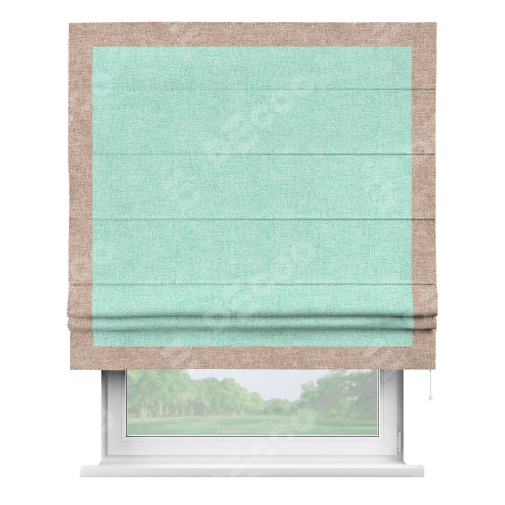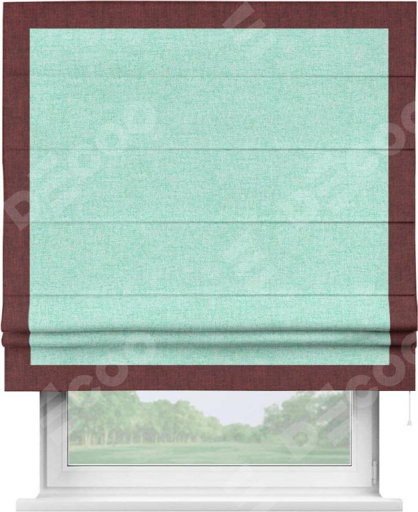 Римская штора пошита из ткани лён кашемир мятный, артикул: 21617, с отделкой кантом «Чесс» отличается своей уникальной деталью — наличием канта не только по бокам и снизу, но и сверху по всем краям шторы. Это придает шторе особенно аккуратный и завершенный вид, делая акцент на границах и форме шторы. Отделка кантом по всему периметру шторы усиливает её декоративные качества и подчеркивает строгую геометрию, что может быть особенно актуально для современных и минималистичных интерьеров.