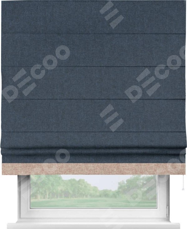 Римская штора пошита из ткани лён кашемир синий, артикул: 21623, с отделкой кантом «Джестер» выделяется своей уникальной особенностью — кантом, расположенным только снизу шторы. Этот дизайн добавляет оригинальности и игривости оконному оформлению, делая акцент на нижней части шторы и создавая интересный визуальный эффект. Отделка кантом на нижнем крае не только служит эстетической функции, но и способствует увеличению прочности и износостойкости ткани в этом месте.