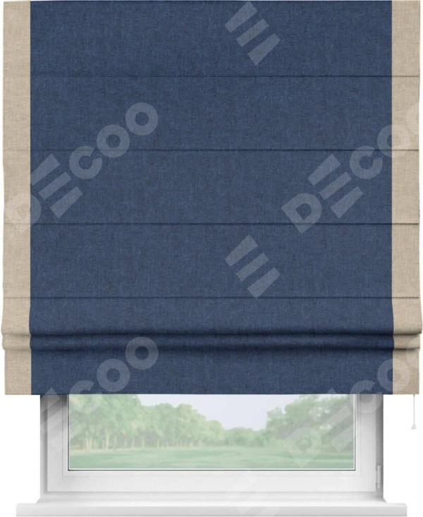 Римская штора пошита из ткани лён кашемир тёмно-синий, артикул: 17215, с отделкой кантом «Стрим Дуо» выделяется наличием кантов по обоим бокам шторы, слева и справа. Этот дизайн придает шторе аккуратный и завершенный вид, акцентируя вертикальные линии и визуально вытягивая окно в высоту. Отделка кантом по бокам не только украшает штору, но и служит практической функцией, укрепляя края и продлевая срок службы изделия.