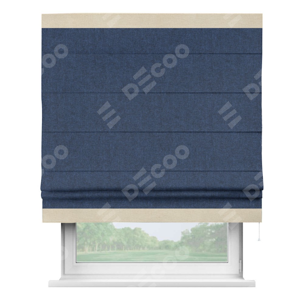 Римская штора пошита из ткани лён кашемир тёмно-синий, артикул: 17215, с отделкой кантом «Горизонт» предлагает уникальное дизайнерское решение, при котором кант располагается только вверху и снизу шторы. Такое решение делает акцент на горизонтальных линиях, визуально расширяя пространство и придавая окну более строгий и организованный вид. Отделка кантом в этих ключевых местах не только украшает штору, но и способствует её долговечности, защищая наиболее уязвимые к износу края.