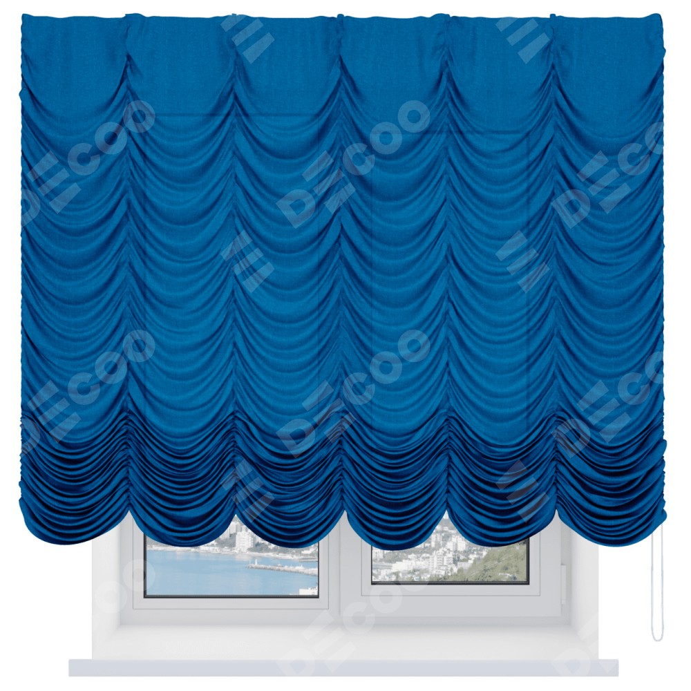 Французская штора производителя «Cortin», используется для проёма, пошита из ткани лён синий, артикул ткани 63742. Имеет универсальный механизм и подходит для монтажа: на потолок и на стену.