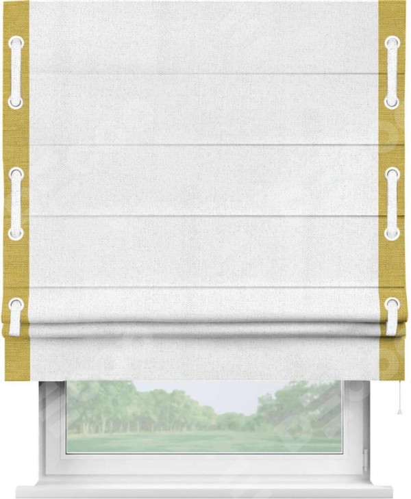 Римская штора пошита из ткани лён белоснежный, артикул: 95632, с отделкой кантом «Стрим Дуо», дополненная декоративными люверсами на этих кантах и протянутым пояском из основного цвета римской шторы, представляет собой высоко декоративное и функциональное решение для оконного оформления. Канты, расположенные по обеим боковым сторонам шторы, уже добавляют изысканности и завершенности внешнему виду. Добавление люверсов и пояска не только усиливает декоративный эффект, но и придает шторе дополнительную текстурность и глубину.