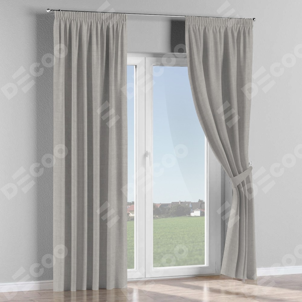 Комплект прямых штор, от производителя «Cortin», пошиты из ткани лён серый, артикул ткани 91410. С изнаночной стороны в верхней части штор пристрачивается шторная лента с декоративными складками «Карандаш». Для создания элегантных складок прямые шторы шьются по стандарту с коэффициентом 1:2 (на 100 см. ширины проёма 200 см. ширины ткани).