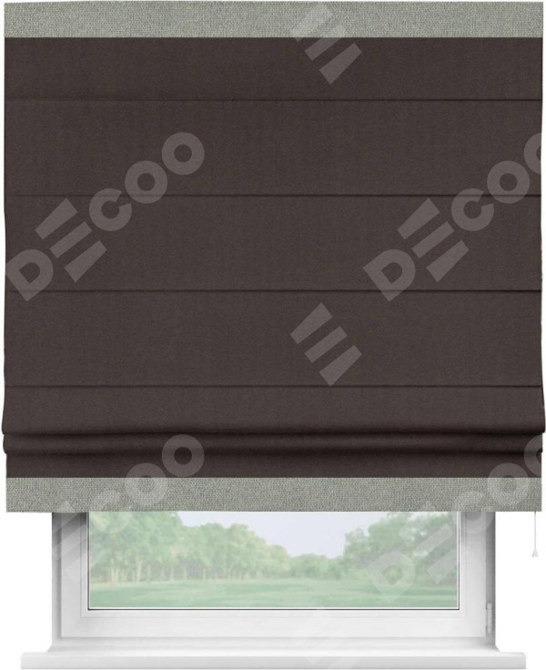 Римская штора пошита из ткани лён димаут венге, артикул: 91001, с отделкой кантом «Горизонт» предлагает уникальное дизайнерское решение, при котором кант располагается только вверху и снизу шторы. Такое решение делает акцент на горизонтальных линиях, визуально расширяя пространство и придавая окну более строгий и организованный вид. Отделка кантом в этих ключевых местах не только украшает штору, но и способствует её долговечности, защищая наиболее уязвимые к износу края.