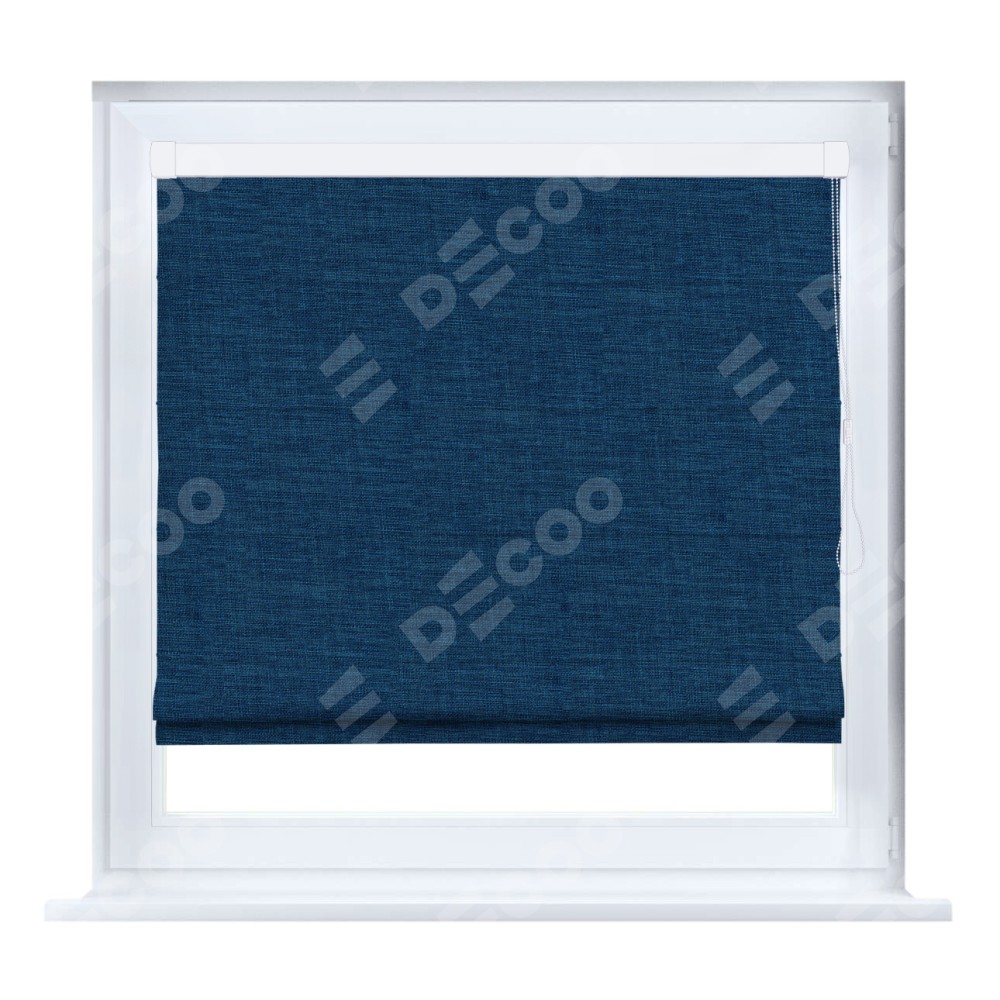 Римская штора производителя «Cortin», устанавливается на створку окна, пошита из ткани лён синий, артикул 104496. Штора шьётся по индивидуальным размерам, для данного типа римской шторы возможная ширина от 35 до 150 см., высота до 250 см.
