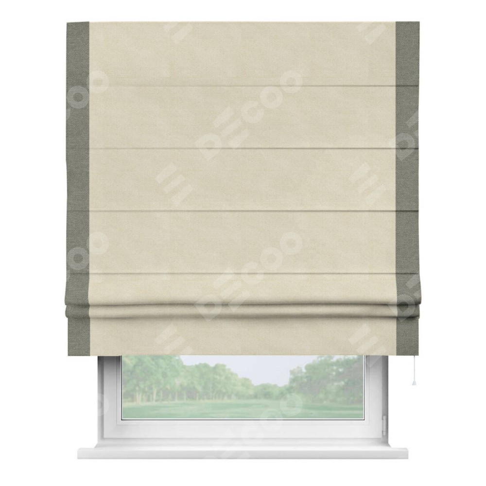 Римская штора производителя «Cortin», используется для проёма, пошита из ткани лён димаут бежевый, артикул 83023. Отделка шторы кантом «Стрим Дуо», ткань для канта используется из льна димаут разной расцветки на выбор. Имеет универсальный механизм и подходит для монтажа: на потолок, на стену и в нишу.