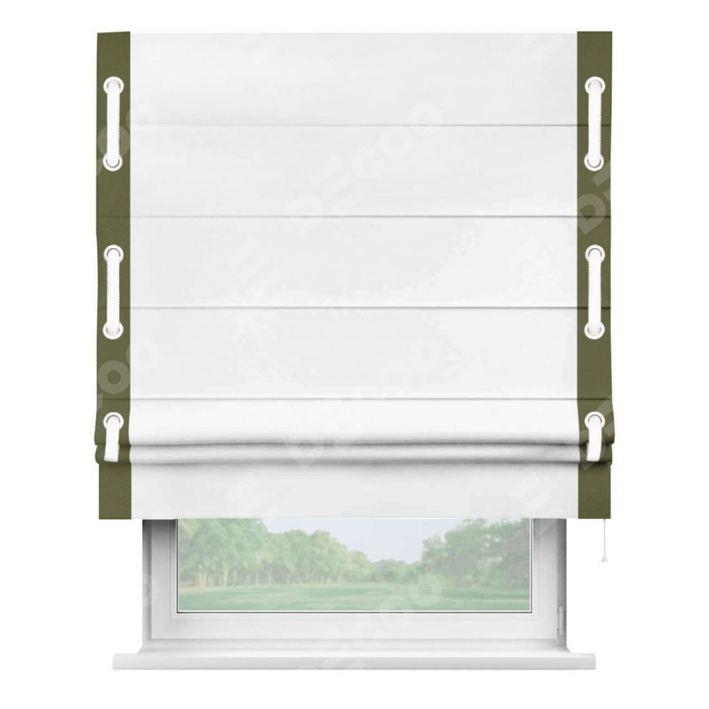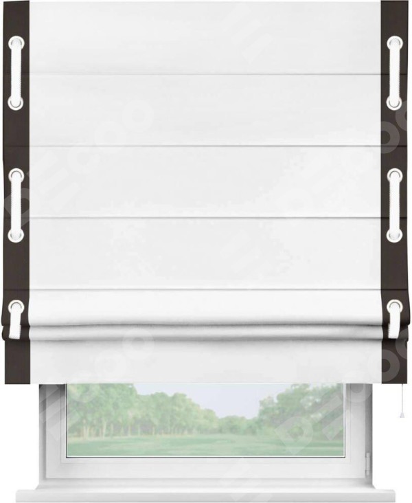 Римская штора «Кортин» для проёма, вайтаут однотонная белая с кантом Стрим Дуо (люверсы с пояском)