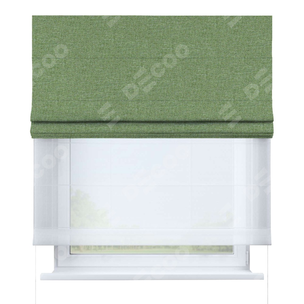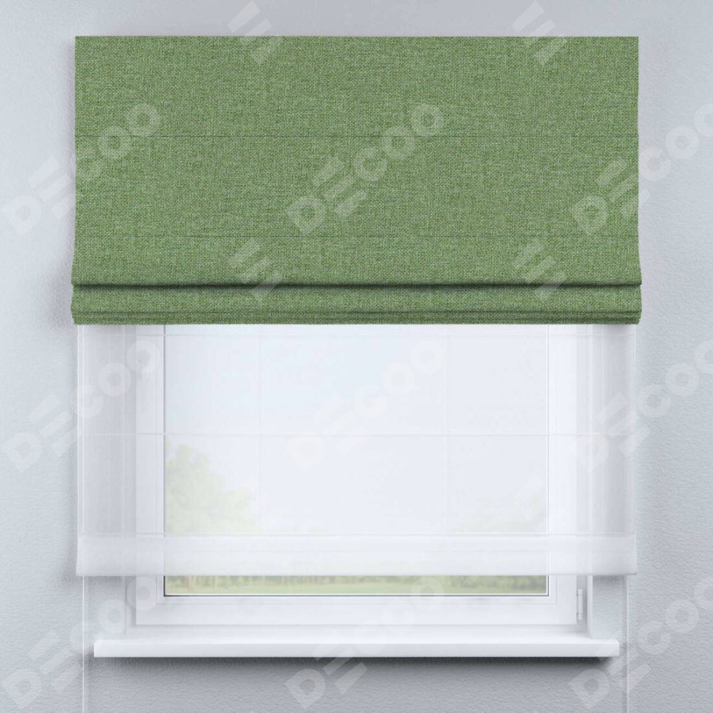Двойная римская штора «День-ночь» от производителя Cortin предназначена для использования в проёмах. Эта штора уникальна тем, что состоит из двух полотен. На лицевой стороне находится лён димаут светло-салатовый (артикул: 128528), обеспечивающий эффективное затемнение. В комплект также входит вторая ткань — легкий белый тюль (артикул: V-01), который добавляет изящества и легкости оформлению окна. Кроме того, доступны и другие разновидности ткани тюль, выбор которых доступен по  ссылке .