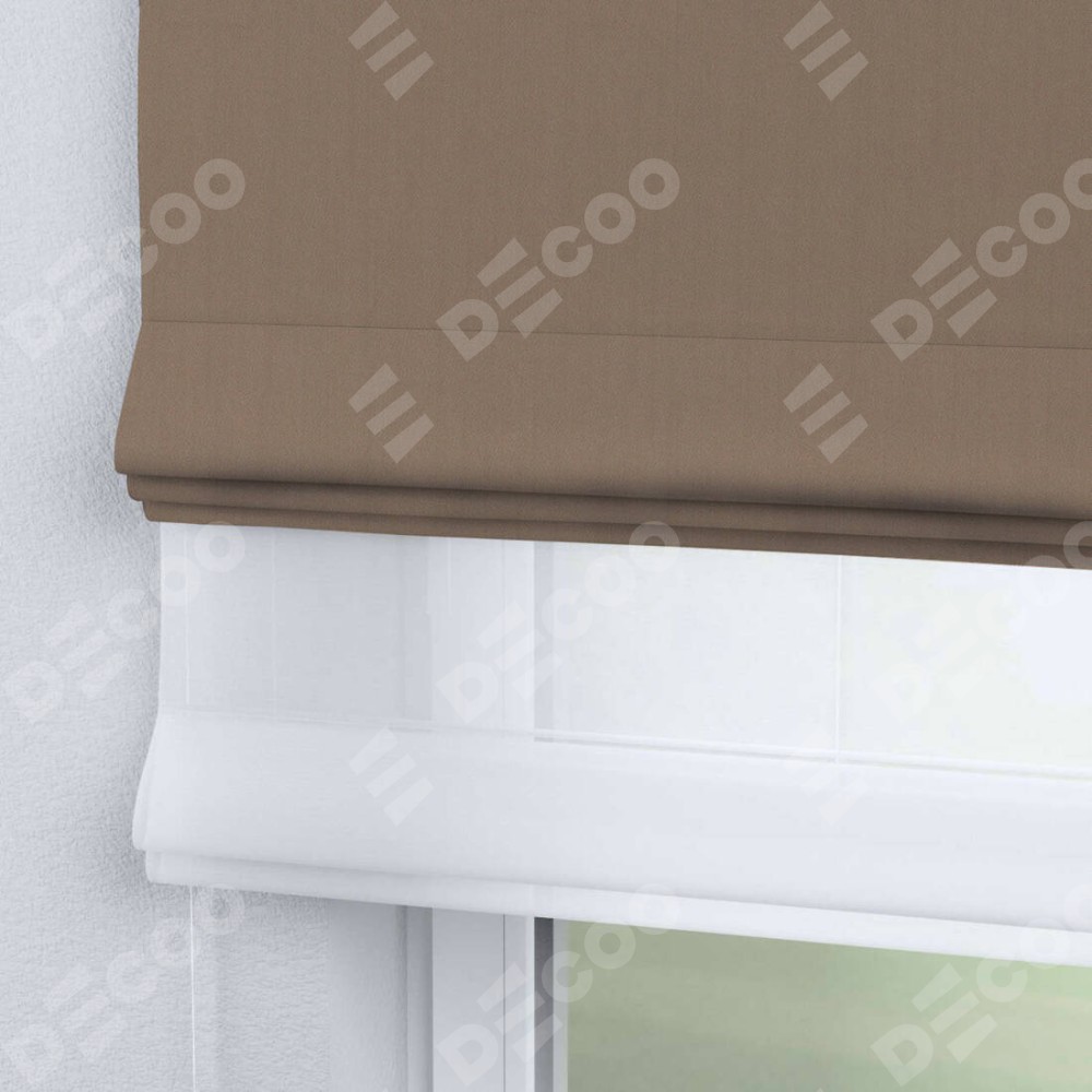 Двойная римская штора «День-ночь» от производителя Cortin предназначена для использования в проёмах. Эта штора уникальна тем, что состоит из двух полотен. На лицевой стороне находится однотонный блэкаут кофейно-бежевый (артикул: 91566−2), обеспечивающий эффективное затемнение. В комплект также входит вторая ткань — легкий белый тюль (артикул: V-01), который добавляет изящества и легкости оформлению окна. Кроме того, доступны и другие разновидности ткани тюль, выбор которых доступен по ссылке .