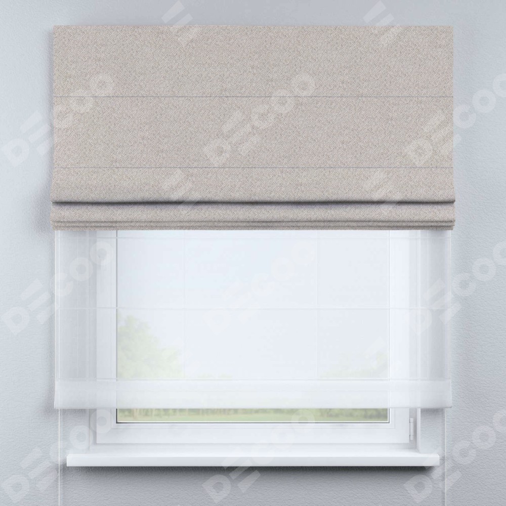 Двойная римская штора «День-ночь» от производителя Cortin предназначена для использования в проёмах. Эта штора уникальна тем, что состоит из двух полотен. На лицевой стороне находится лён димаут бежевый (артикул: 01), обеспечивающий эффективное затемнение. В комплект также входит вторая ткань — легкий белый тюль (артикул: V-01), который добавляет изящества и легкости оформлению окна. Кроме того, доступны и другие разновидности ткани тюль, выбор которых доступен по ссылке .